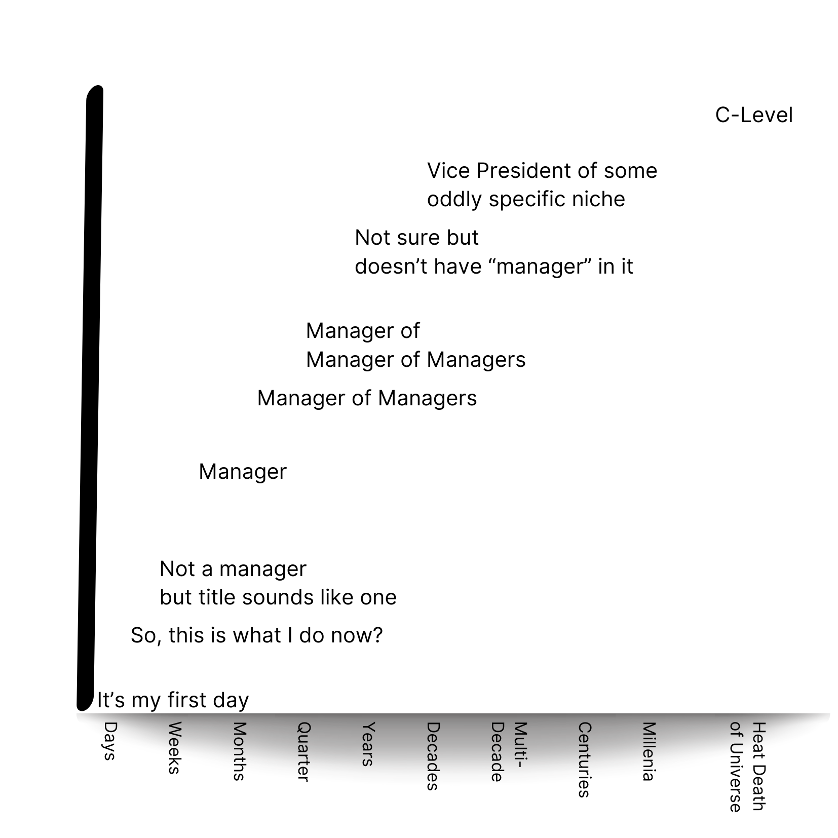 Imagine, if you will, a standard chart with a horizontal and vertical axis. On the vertical axis, we have your position in the organization, starting from lowly individual contributor and ascending to the rarefied air of the C-suite. The horizontal axis represents time, stretching from the immediate now to some far-flung future where your company either dominates the galaxy or has long since been consigned to the dustbin of corporate history. Your current position on this imaginary map dictates not just your responsibilities, but your entire weltanschauung within the company (that's "worldview" for those of us who don't casually drop German philosophy terms to sound fancy).